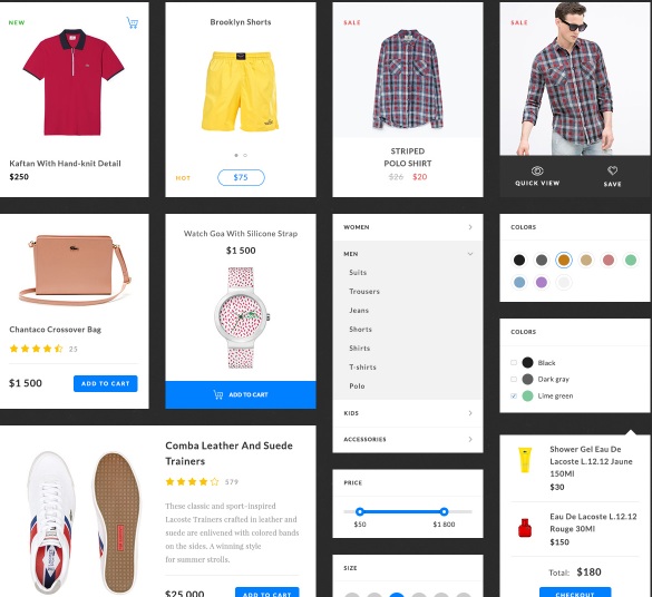 A modern collection of UI elements, including navigation bars, product boxes, sliders, and more.