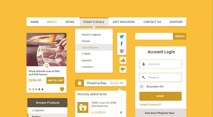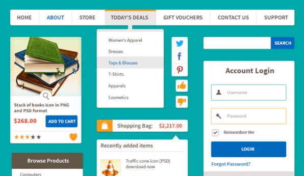 A versatile kit featuring shopping carts, product widgets, login screens, and more, in editable PSD format.