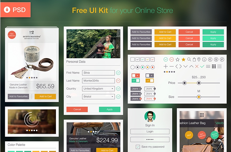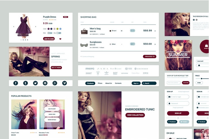 An attractive ecommerce UI kit with appealing elements, available in PSD format.